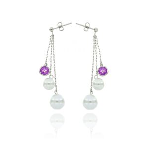Pendientes de Plata rodiada con dos perlas y piedra morada