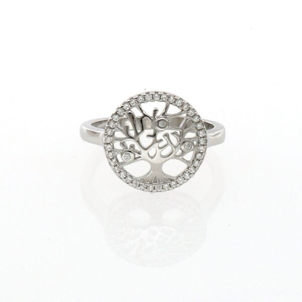Anillo con piedras. Con forma redonda, de 15 mm de diámetro y árbol de la vida en el centro.