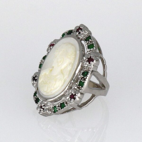 Anillo rodiado con camafeo y circonitas color rubí y verde de 2 mm.