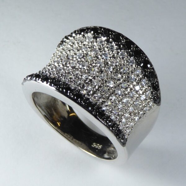 Anillo rodiado con circonitas blancas y una fila en los extremos negras. 17 mm de ancho en disminución a 5.80 mm.