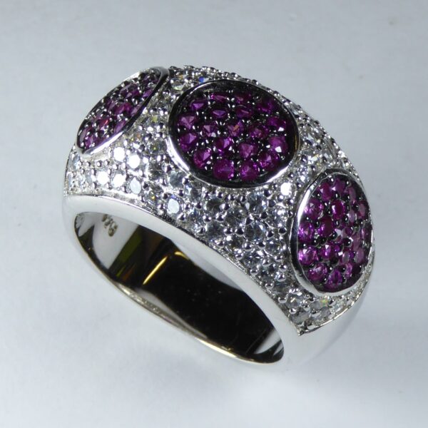 Anillo rodiado con fondo de circonitas blanco y círculos con circonitas fúsias. 13.60 mm de ancho con disminución a 5.42 mm.