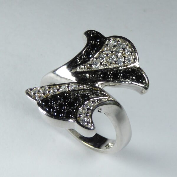 Anillo rodiado que combina circonitas en blanco y negro. 22.30 mm de grosor.