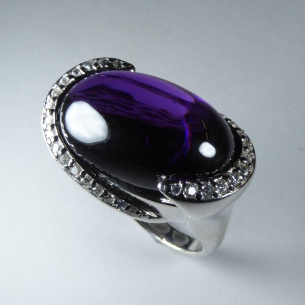 Anillo rodiado , con piedra ovalada color amatista rodeado de circonitas. Anillo de 17.65 mm de ancho.