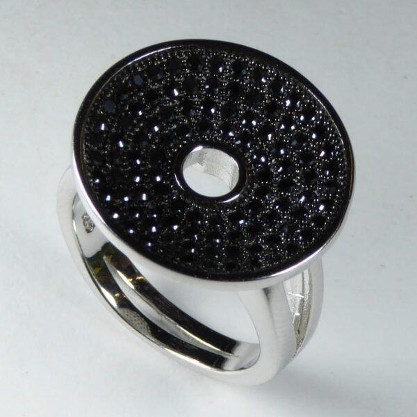 Anillo rodiado en forma circular concava, con 20.30 mm de diámetro. Con circonitas negras, dejando un calado la parte central.
