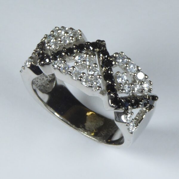 Anillo rodiado que combina circonítas blancas , negras y huecos entre ellas. De ancho 8.50 mm