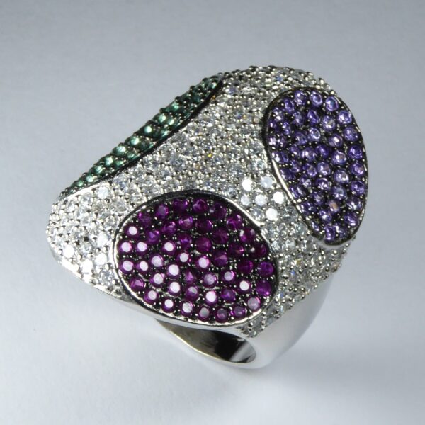 UncategorizedAnillo rodiado , con circonitas en color rubí, blanca,morado y verde.