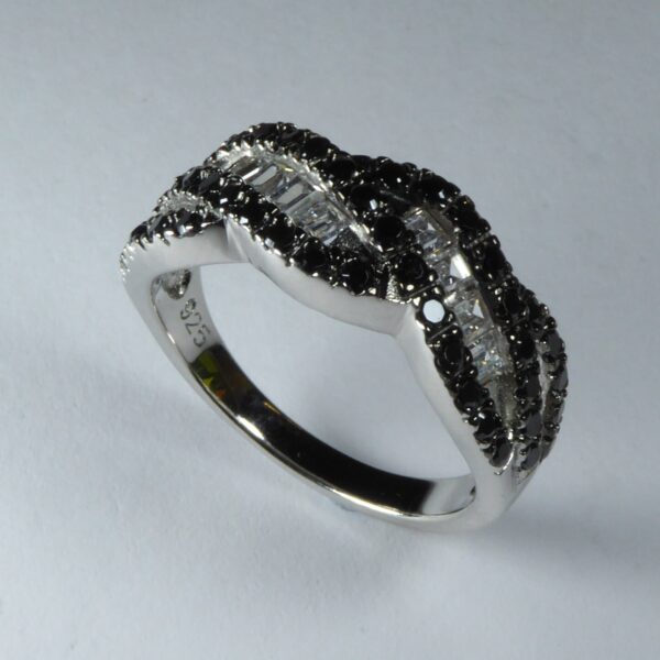 Anillo rodiado. Formando ondas con circonitas negras y blancas cuadradas.