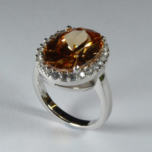 UncategorizedAnillo rodiado. Con piedra diamantada central en color champagne, rodeado de circonitas de 1.5 mm .