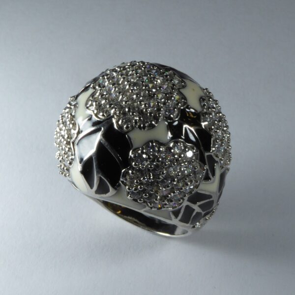 Anillo con circonitas blancas 2 mm. Combinado con dibujos de hojas esmaltados en negro y blanco.