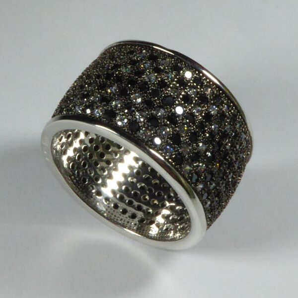 Anillo rodiado, con circonitas en gris y negro de 2 mm.