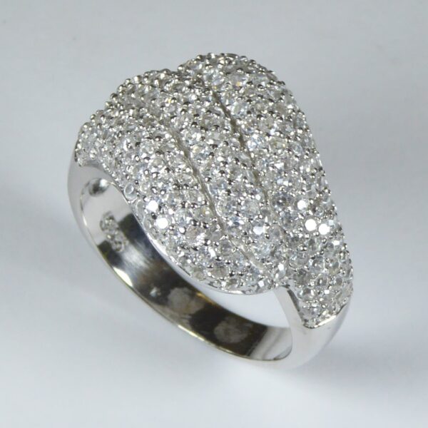 Anillo rodiado con circonitas blancas de 1 mm repartidas en tres bloques.
