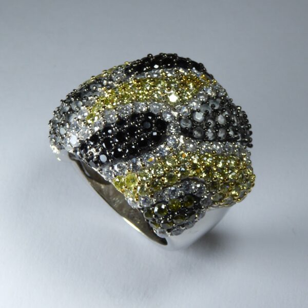 UncategorizedAnillo rodiado. Con circonitas de 2 mm combinando diferentes colore, amarillo, negro, gris, blanco y negro.
