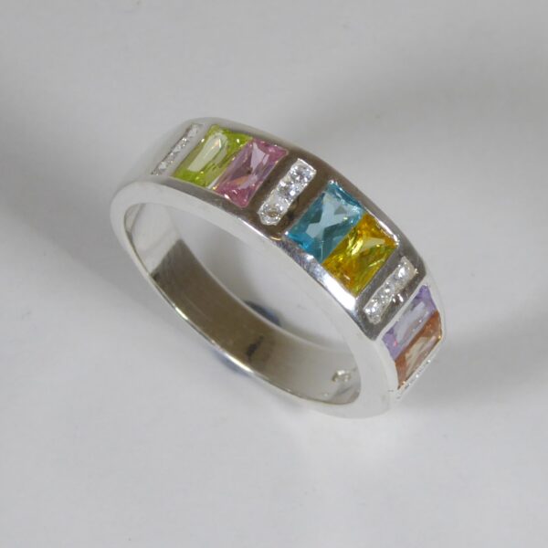 Anillo rodiado. Que combina circonitas blancas de 1.50 mm con circonitas de colores,oliva, rosa, aguamarina y champagne de 5 mm.