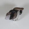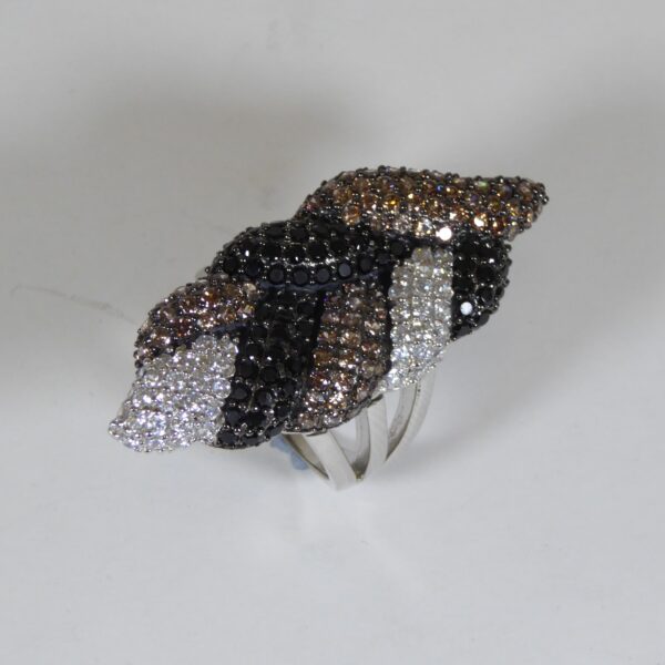 Anillo rodiado. De circonitas de 1.50 mm. Formando el dibujo de una espiga, combinando los colores, blanco, negro y ahumado.