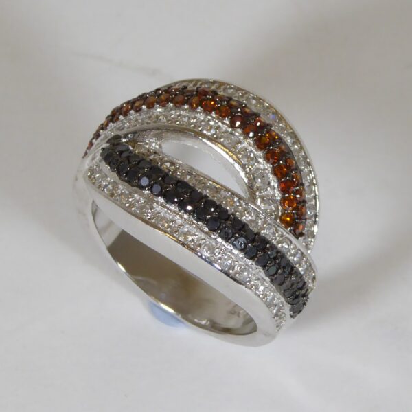 Anillo rodiado con circonitas blancas, negras, citrino y un hueco en el centro de 2.40 mm.