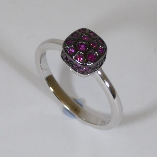 Anillo rodiado con forma de cubo y circonitas fucsias.