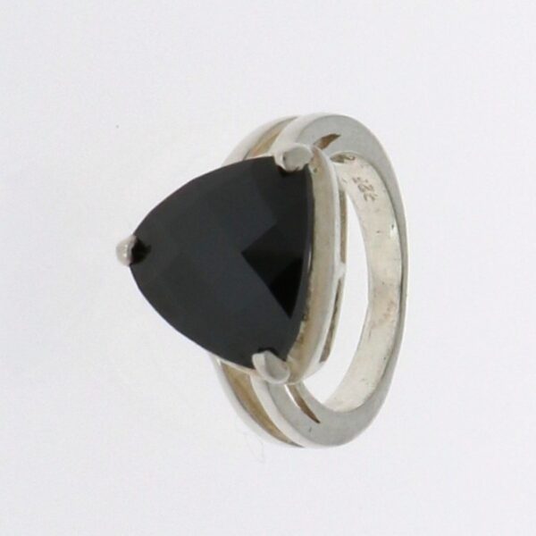 Anillo rodiado con piedra negra. De forma triangular y 14.20 mm de ancho.