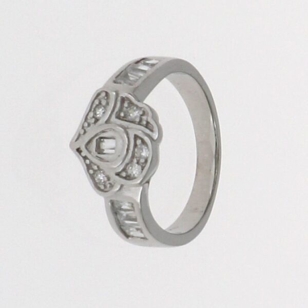 UncategorizedAnillo rodiado con circonitas de 2 mm, una en forma de lagrima en el centro y rectangulares a los lados.