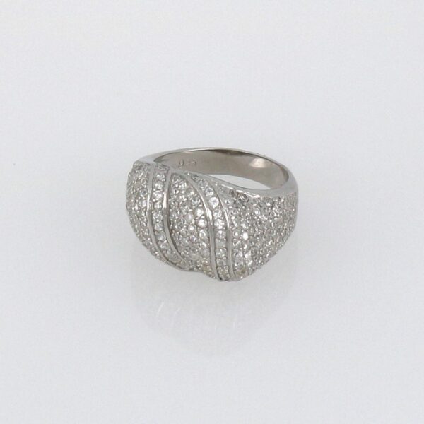 Anillo rodiado con circonitas de 1.50 mm combinado con cuatro tiras lisas.