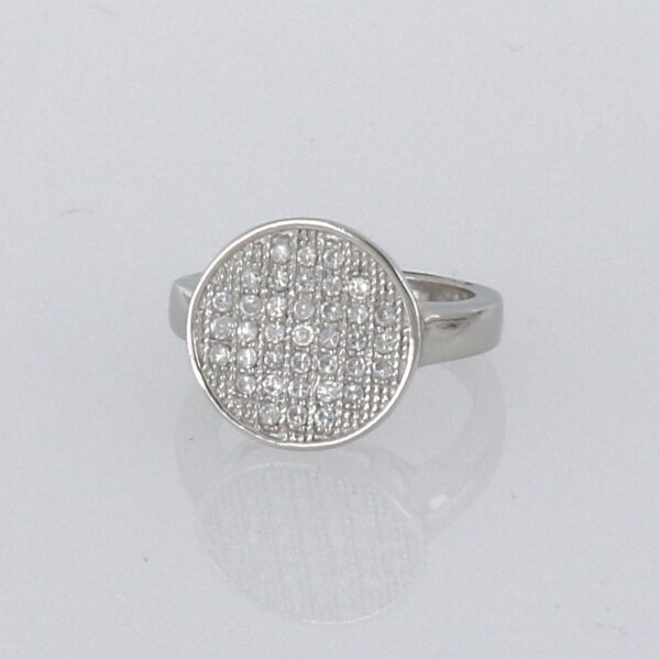 Anillo rodiado de forma circular, de 14.30 mm de diámetro y circonitas de 1.30 mm.