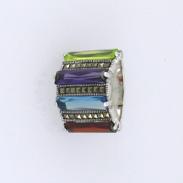 Anillo rodiado con piedras alargadas de 15 mm en colorres rubí,amatista, aguamarina y oliva.