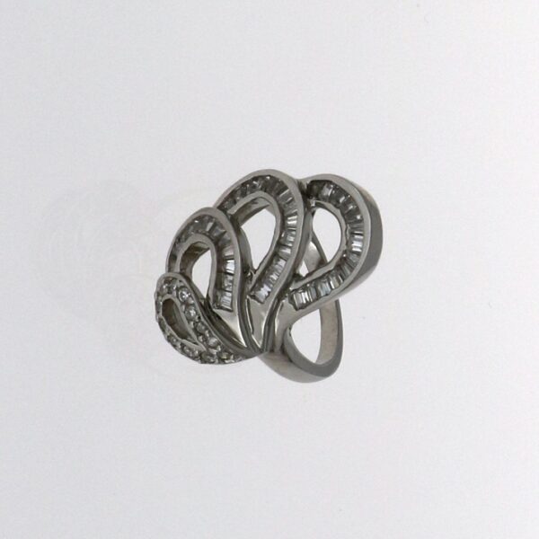 Anillo rodiado de circonitas. Con forma de ondas en disminución.