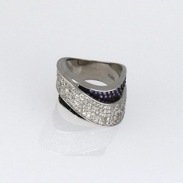 Anillo rodiado. Con circonitas de 1.50 mm en blanco, negro y morado.