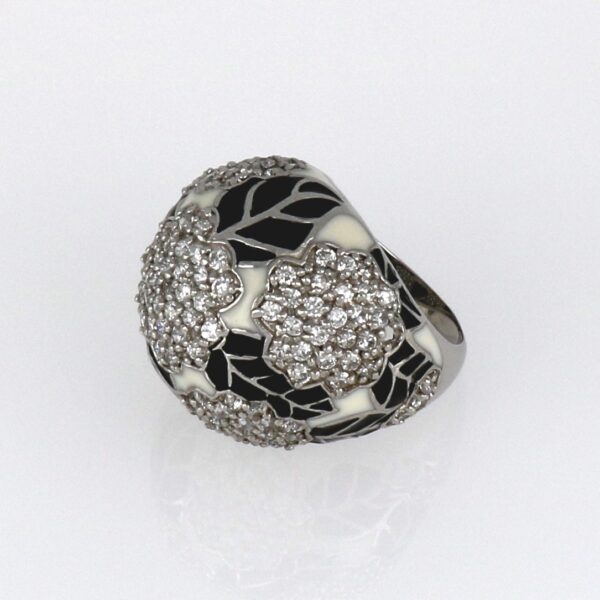UncategorizedAnillo rodiado. Con base esmaltada blanca y hojas negras. Formando flores de circonitas de 2 mm.