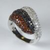 Anillo rodiado con tres bloques de circonitas de 1 mm en diferente colores cada bloque. Rubí, negras y blancas.