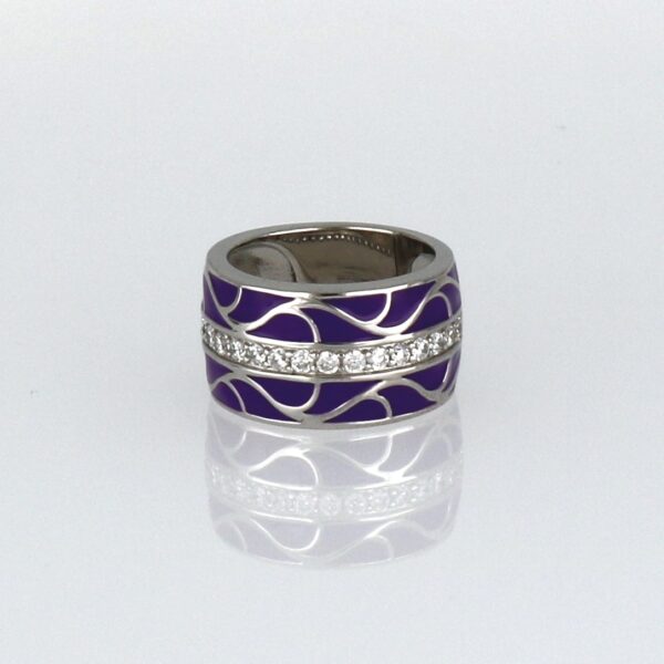Anillo rodiado. Esmaltado en morado con circonitas de 2 mm en la parte central.
