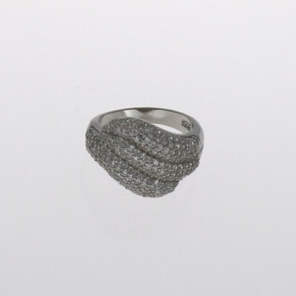 Anillo rodiado con circonitas blancas de 1 mm repartidas en tres bloques.