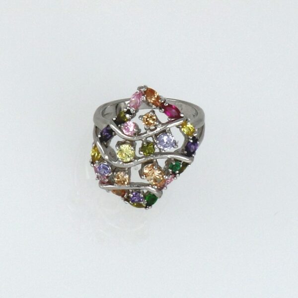 Anillo rodiado. Con circonitas de diferentes formas y colores. Champagne, oliva, aguamarina, rosa.