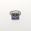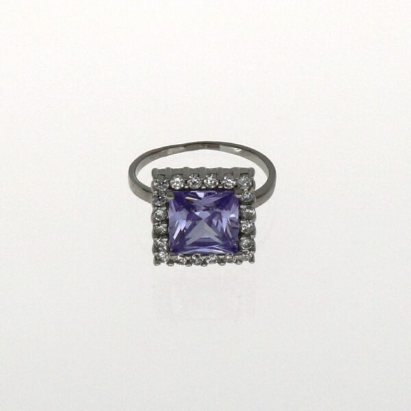 Anillo rodiado. Con piedra de color lila cuadrada, de 9.30 mm. Rodeada de circonitas blancas de 2 mm.