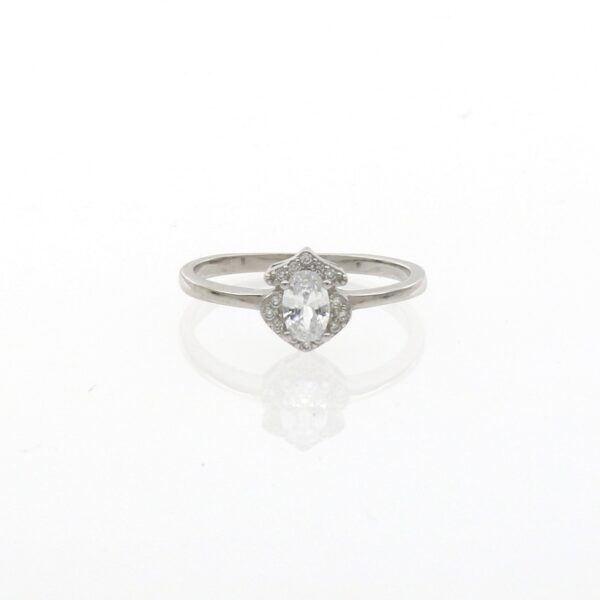 Anillo rodiado con circonita rectangular de 6 mm. Rodeado de circonitas de 1.50 mm.