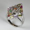 UncategorizedAnillo rodiado, con forma de rombo de filigranas y circonitas de colores.