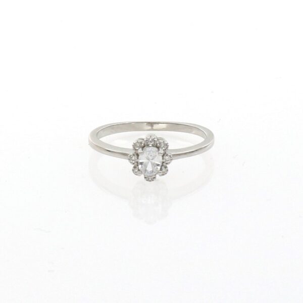 Anillo rodiado. Con circonita de 5 mm en la parte central,rodeada de circonitas de 2 mm.