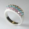 UncategorizedAnillo rodiado con tres filas de circonitas en colores rosa, aguamarina y champagne de 2 mm.