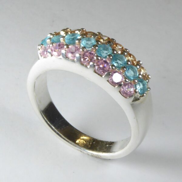 Anillo rodiado con tres filas de circonitas en colores rosa, aguamarina y champagne de 2 mm.