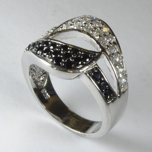 Anillo rodiado con circonitas blancas y negras de 2 mm.