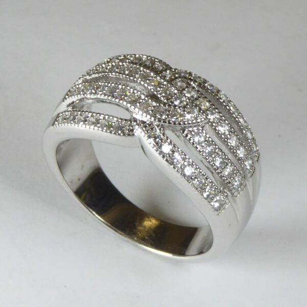 Anillo rodiado con circonitas de 1 mm. De ancho 10.30 mm que disminuye a 3.40 mm.