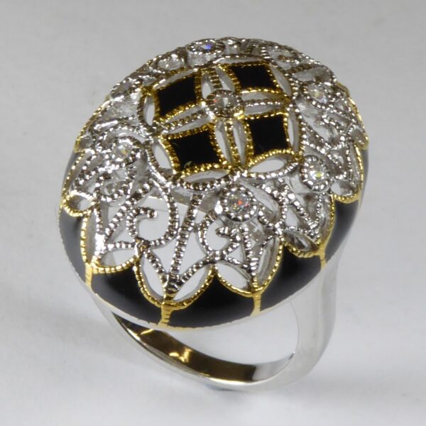 Anillo ovalado de filigrana con circonitas blancas, decorado con esmalte negro chapado.