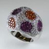Anillo rodiado con circonitas blancas y a diferente altura decorado con circonitas en color naranja y fusia. 20 mm de ancho disminuyendo a 4 mm.
