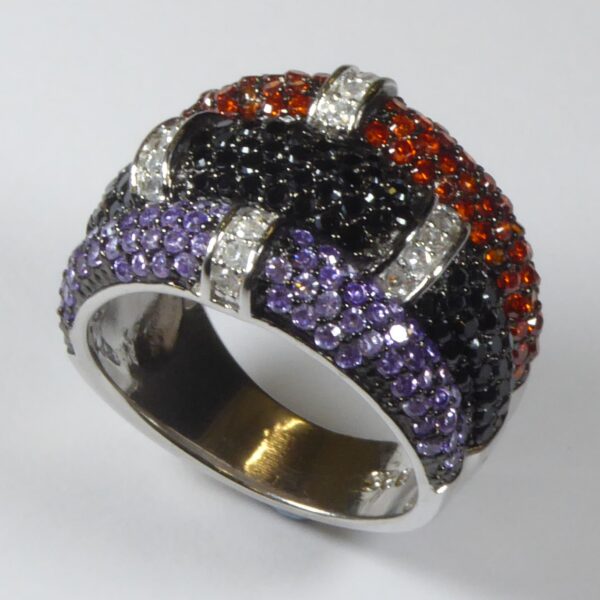 UncategorizedAnillo de circonitas de 2 mm. Combinando los colores blanco, negro, rubí y amatista. Con 15.50 mm de ancho disminuyendo a 5 mm.