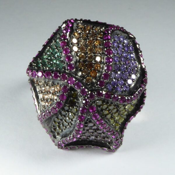 Anillo rodiado con circonitas de colores, lila. oliva , champagne, moradas y verdes.