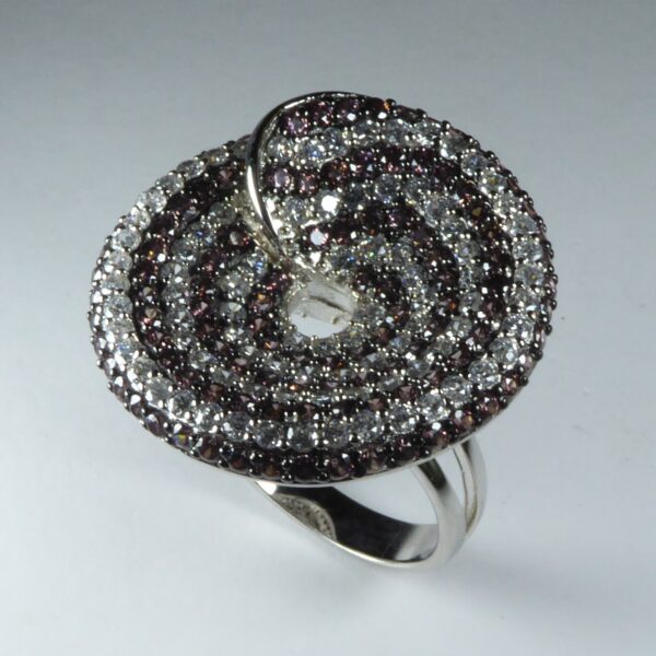 Anillo rodiado con forma circular de 29.20 mm. Con circonitas rosas y blancas.