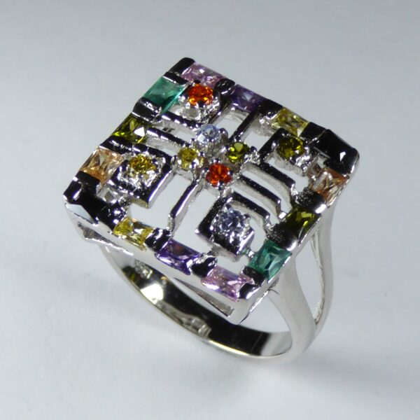 Anillo rodiado , con forma cuadrada y circonitas de colores. Verdes, rosas, lilas, negras, oliva, moradas, citrinas y blancas.