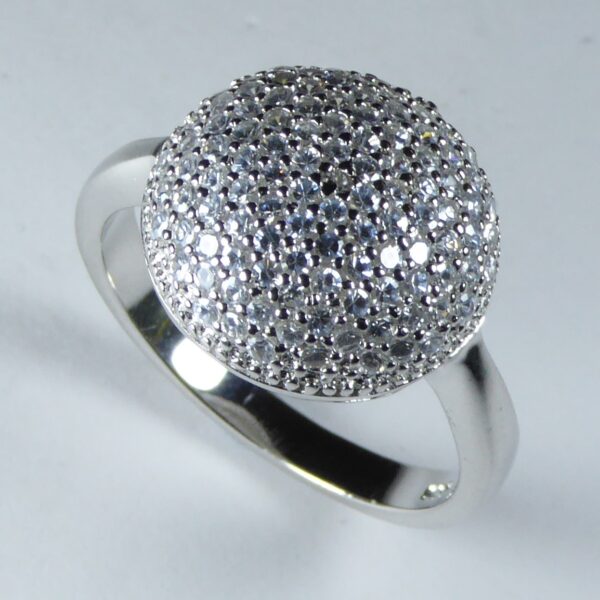Anillo rodiado. Con forma de semiesfera de 14.30 mm de diámetro y circonitas de 1.50 mm.