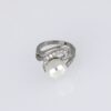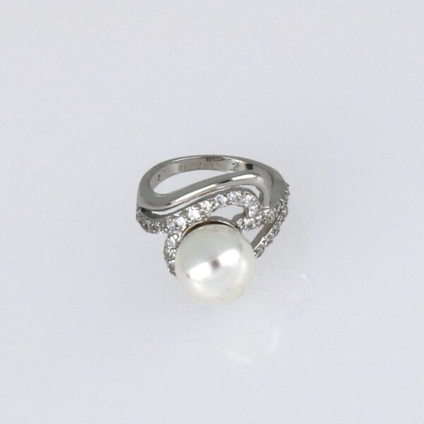 Anillo rodiado. Con perla de 10 mm en el centro. Rodeada de ondas lisas y con circonitas de 2 mm en su base.