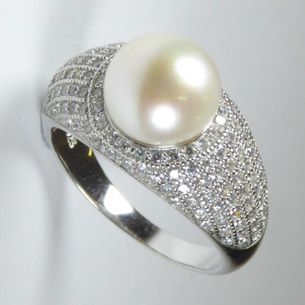 Anillo rodiado con circonitas blancas y una perla en el centro de 10 mm.