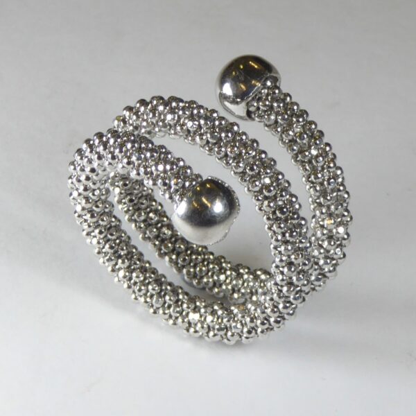 UncategorizedAnillo rodiado. Con malla diamantada rígida, que da dos vueltas con terminación en bola lisa